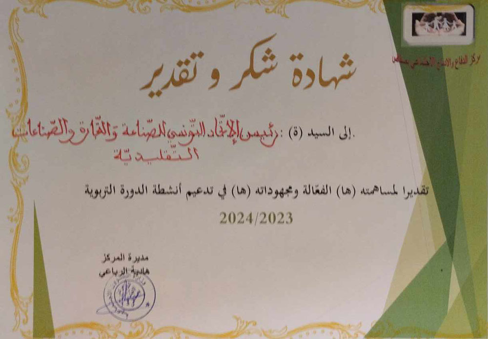 حظي الاتحاد بالتقديروالتكريم لدعمه لنشاط الهياكل الاجتماعية بالجهة وتجلى ذلك في شهادة تقديرمن طرف مركز الدفاع والإدماج الاجتماعي بصفاقس تسلمها نيابة عن رئيس الاتحاد السيد وسام عبد الغني مسؤول الشؤون الاجتماعية بإدارة الاتحاد. وكان ذلك خلال حفل اختتام الدورة التربوية للمركز لسنة 2023/2024 الذي أشرف عليه السيد منذر الزعيبي المدير الجهوي للشؤون الاجتماعية. وشهد الحفل عديد الفقرات المتنوعة وعرضا لنشاط المركز قدمته مديرته السيدة هادية الرباعي.