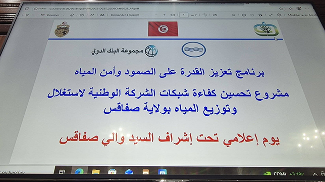 تعتزم الدولة تنفيذ مشروع هام يضم عدة مكوّنات، من أبرزها تحسين نجاعة شبكات الشركة الوطنية لاستغلال وتوزيع المياه وذلك بتمويل من البنك الدولي. وفي اطار التعريف بهذا المشروع نظم في صفاقس يوم إعلامي مثل الاتحاد فيه السيد يوسف بن حمد عضو المكتب التنفيذي.